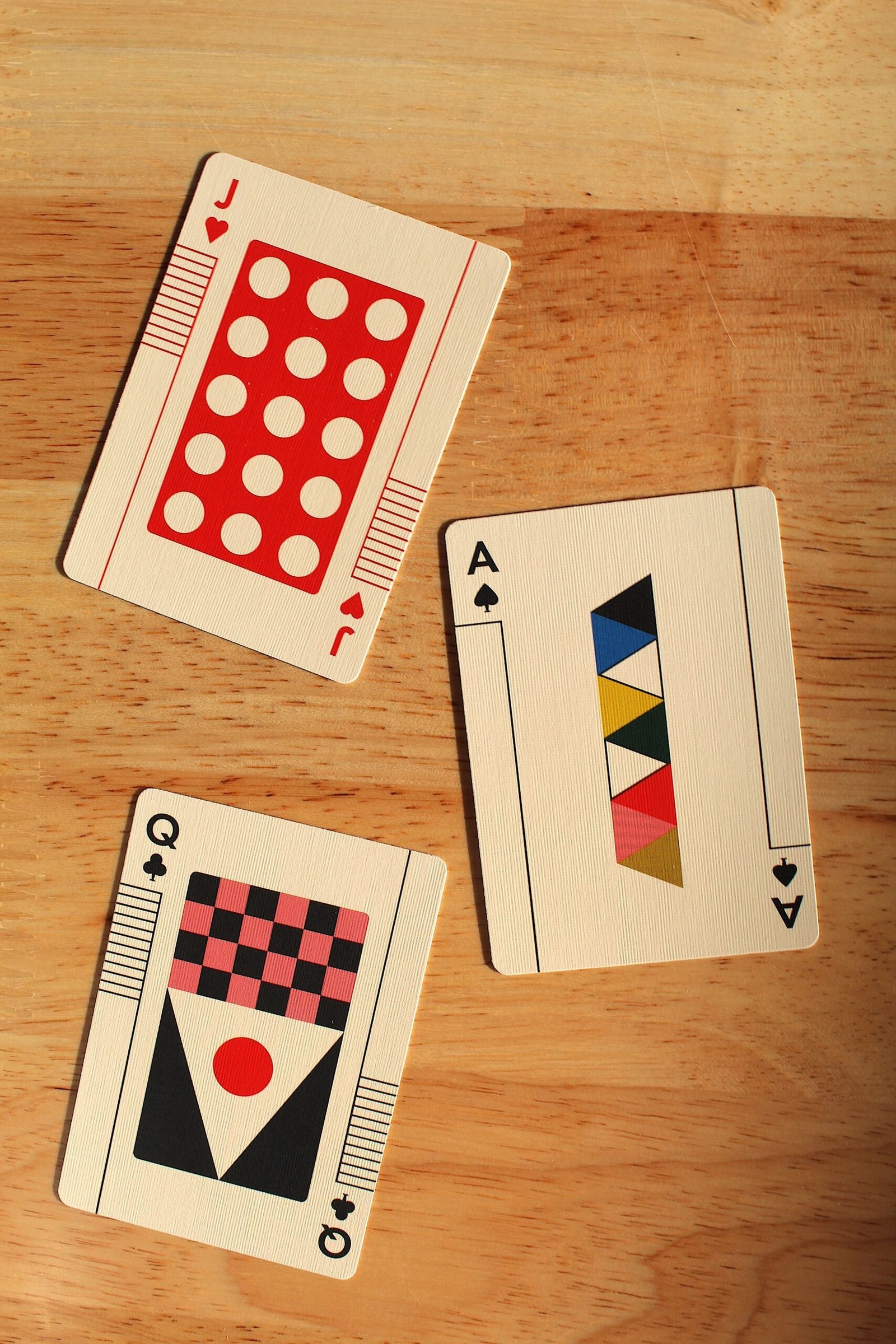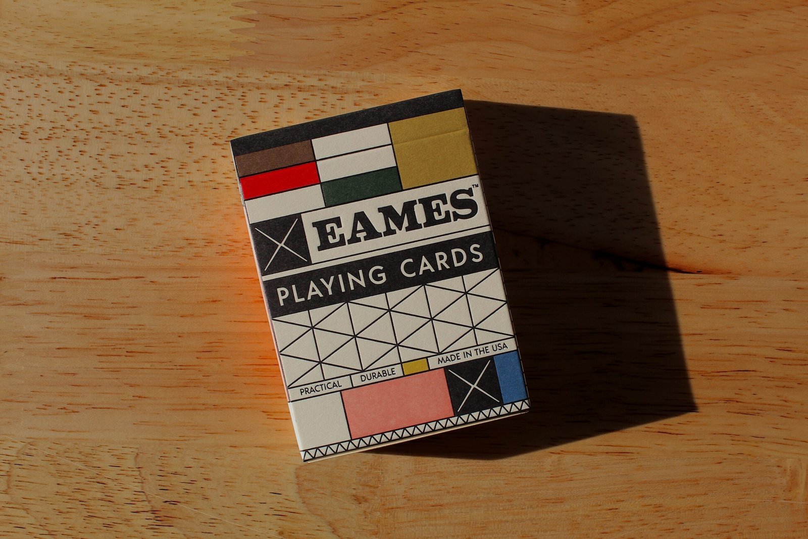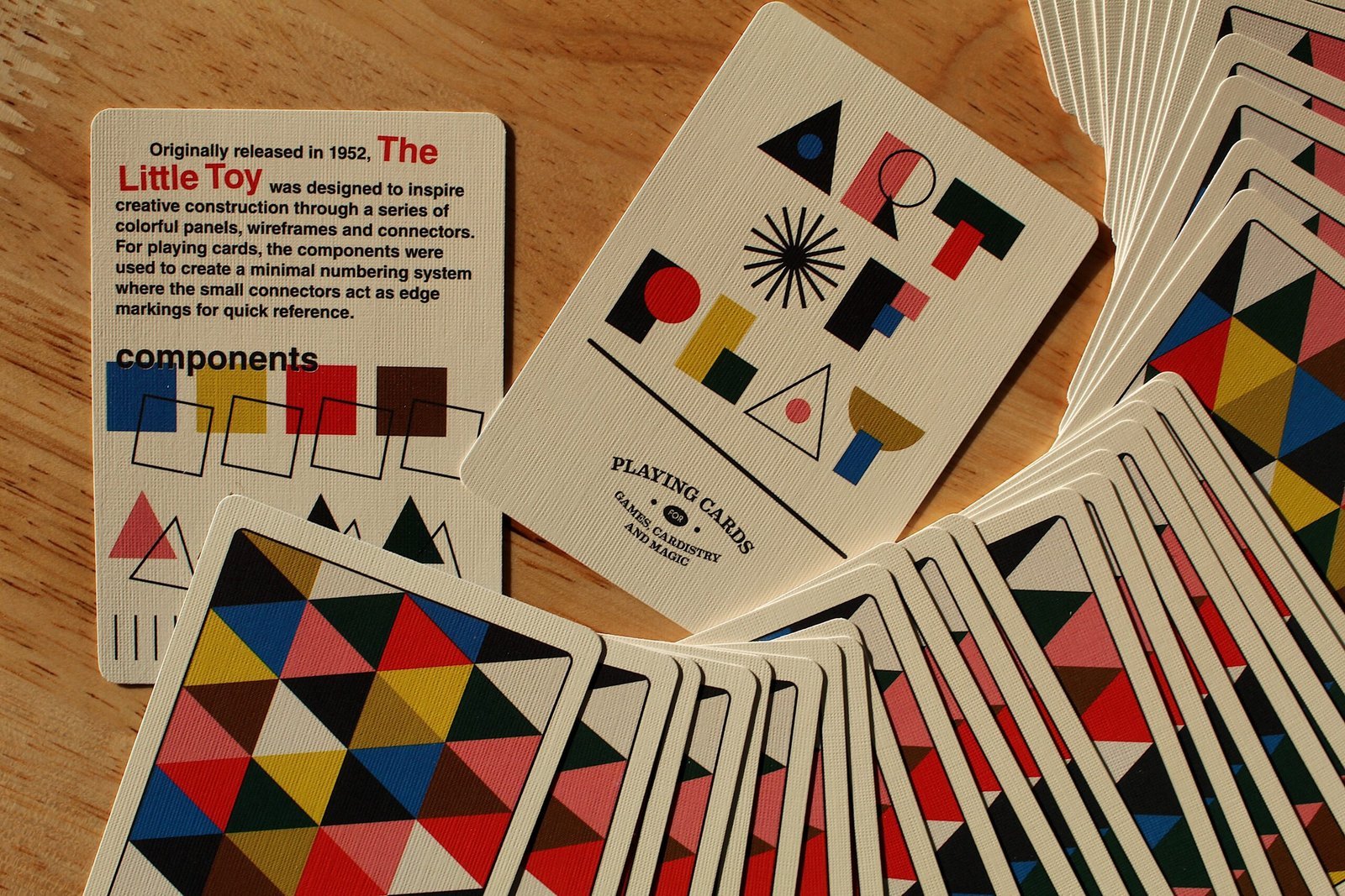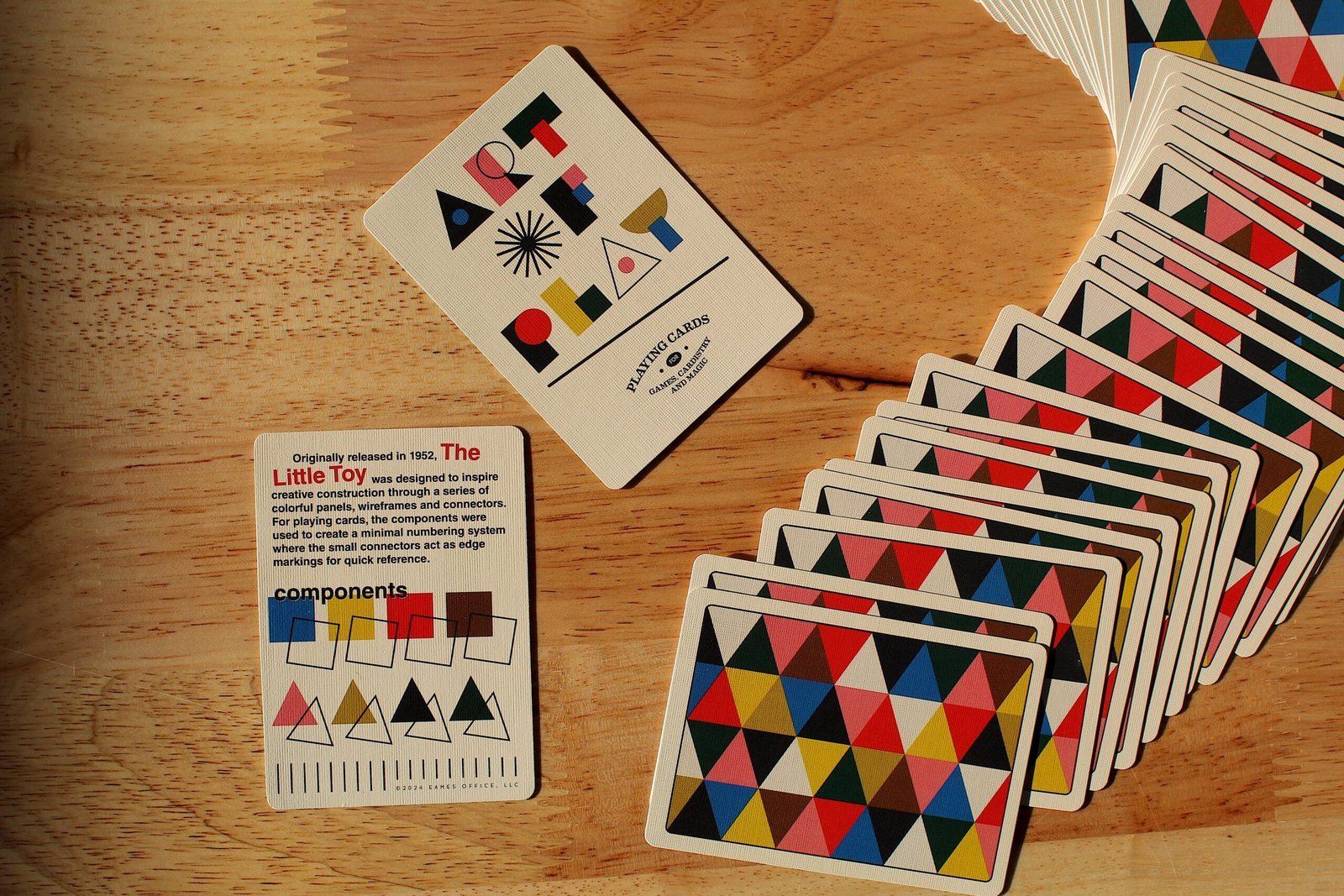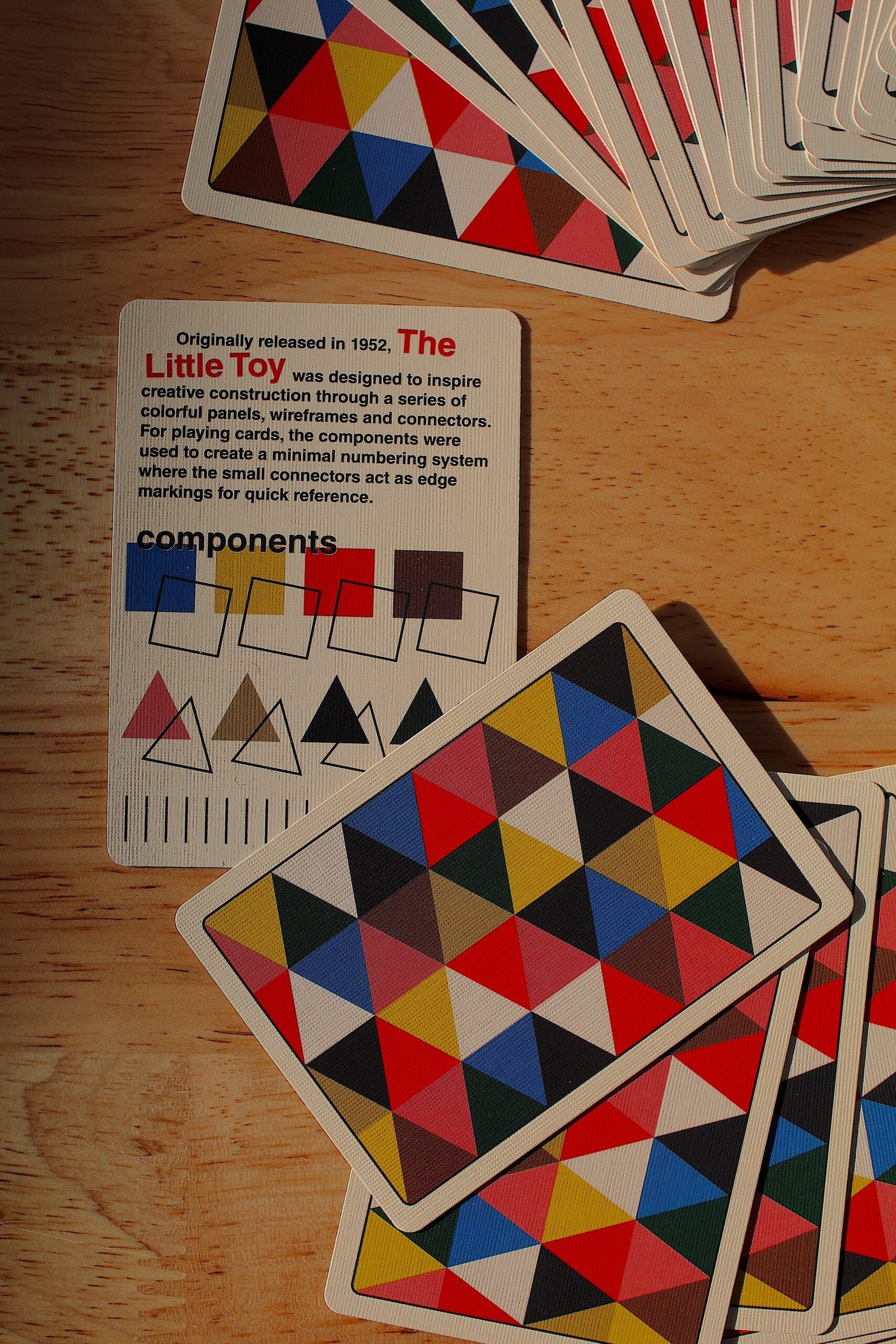 Originally released in 1952, The Little Toy was designed to inspire creative construction through a series of colorful panels, wireframes and connectors. For playing cards, the components were used to create a minimal numbering system where the small connectors act as edge markings for quick reference. Eames Playing Cards come in a letterpress-printed tuck case printed on sustainable paper using vegetable-based dyes. The design of the box references the famous home built by Charles and Ray, a creative base where they lived for many years. Made in the USA.